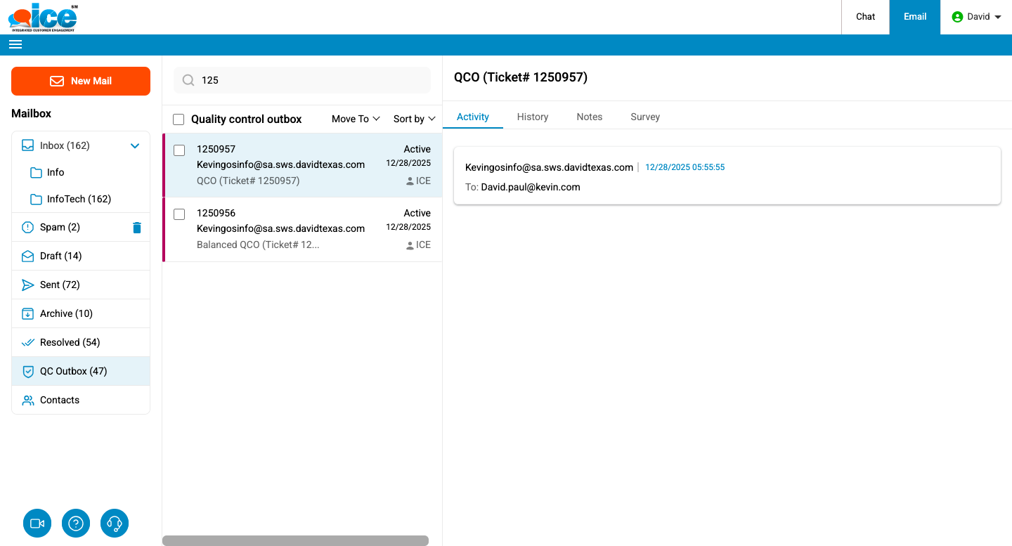•An unassigned ticket moved from Inbox to the Quality Control Outbox Folder with active status and assigned to admin will remain same. Operator will be able to view the ticket in email grid but will not be able to access it due to lock icon.