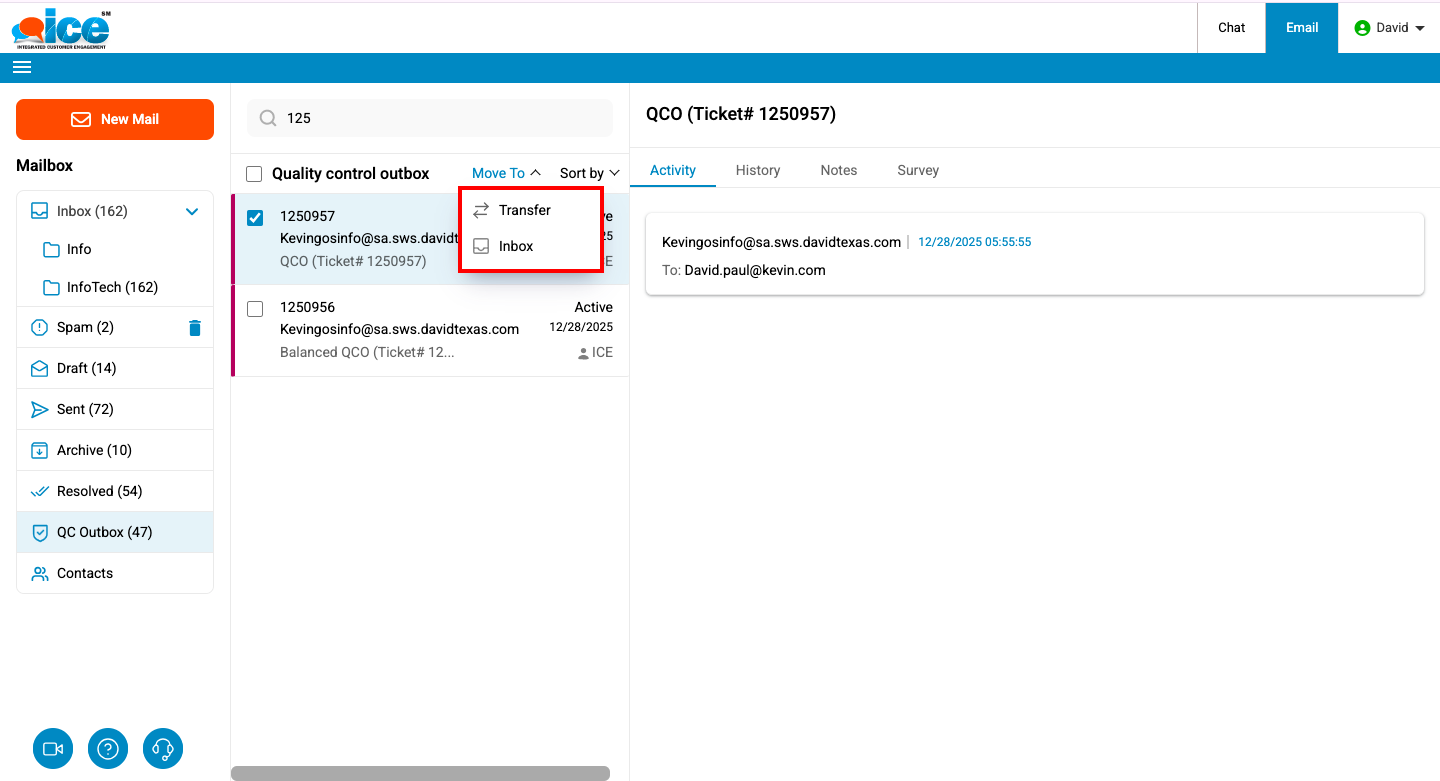 - Click Move to tab and Inbox button to move a ticket back to the Inbox folder.
