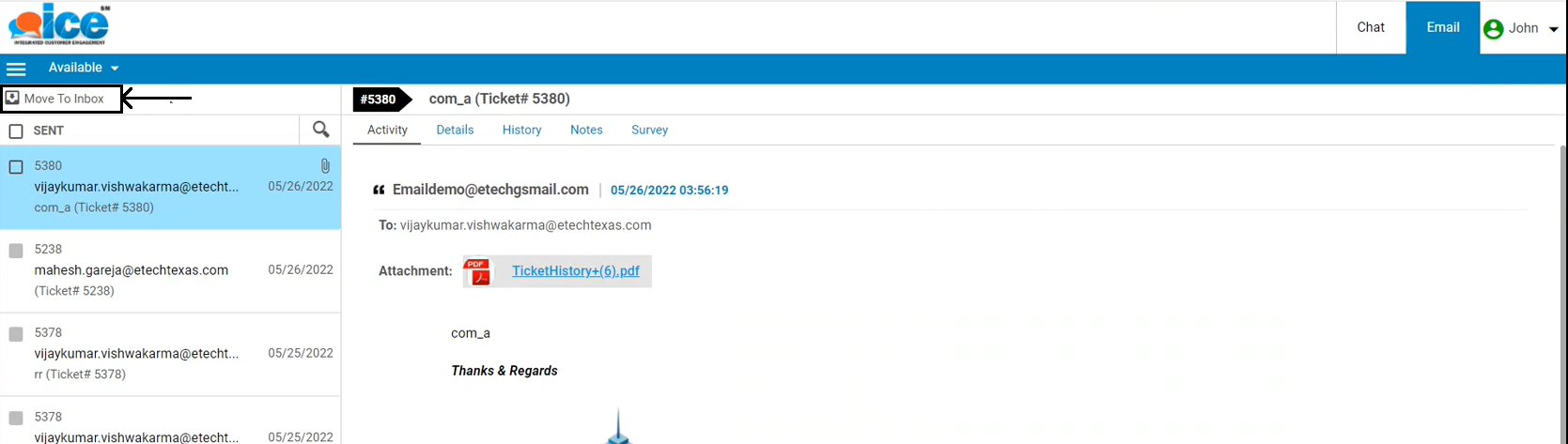 Move to Inbox button is displayed in the Sent Folder of the Email tab as shown in the following image: