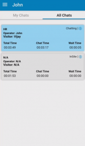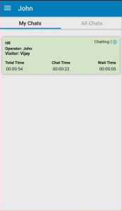 - The above console will include two tabs- My Chats and All Chats. The “My Chats” tab will display the personal chats of agents. This tab will be by default selected. “All Chats” will display all the chats of the same skill.