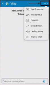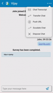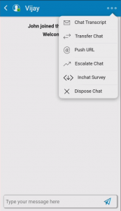 A chat tool bar in ICE mobile application includes similar options like ICE desktop version. These include- chat transcript, transfer chat, Push URL, Escalate chat, Inchat Survey and Dispose chat as shown in the below screen-