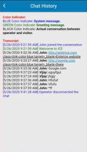 - The history tab also displays the chat transcript history for a visitor like the one as shown below-