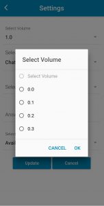 - Volume Settings- Click “Select Volume” dropdown box to set a volume level of the chat and click OK button after selecting the desired volume level. This is as shown below-