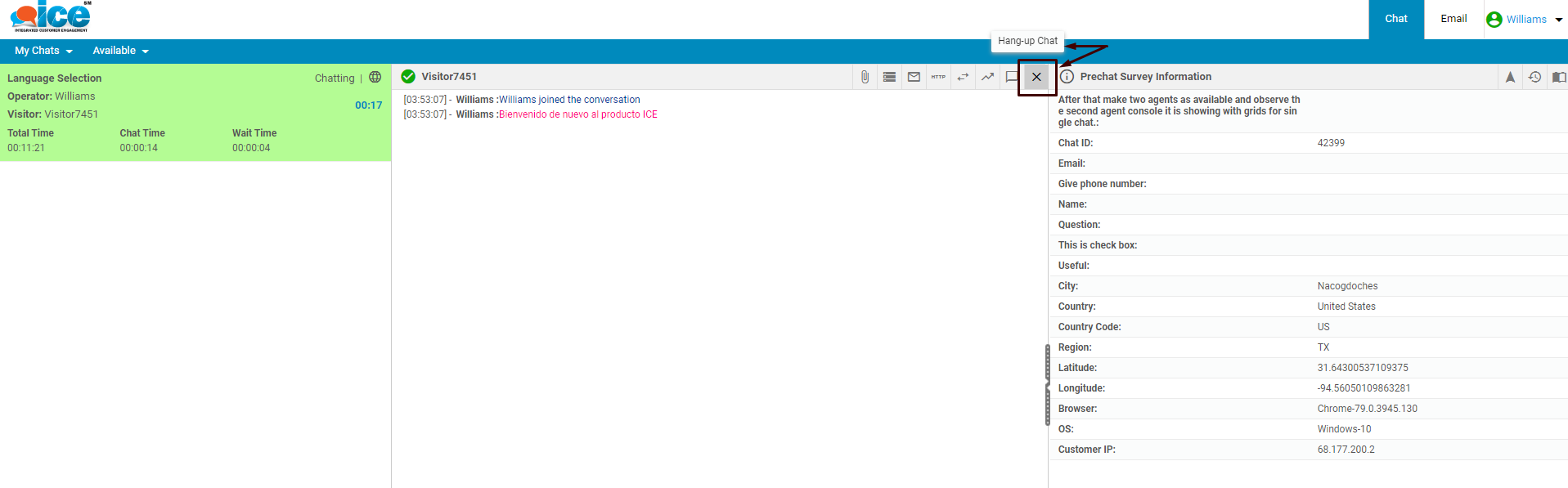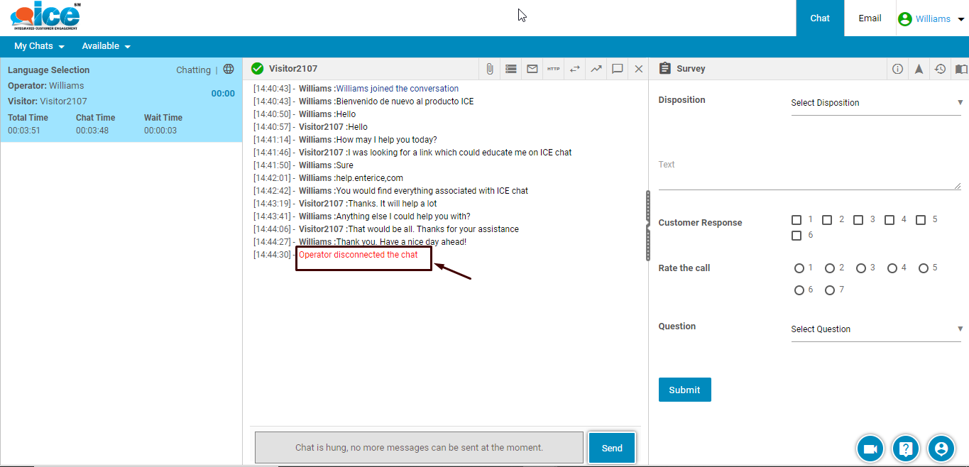• When Hang-up button is clicked then chat gets disconnected and system generates a chat disconnection message on operator screen. This is as shown highlighted below-