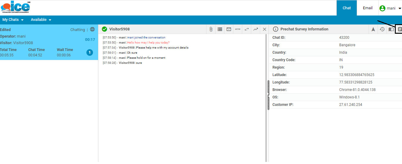 An agent has the option to fill up the survey during an ongoing chat by clicking on the Survey icon. This is as shown in the below screen-