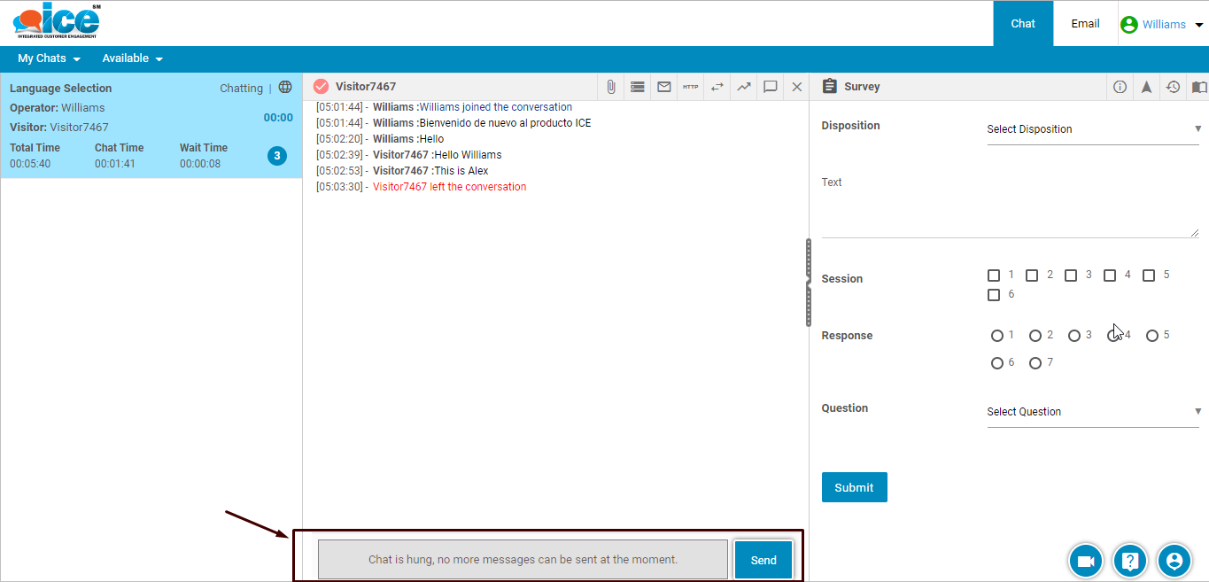 The Submit button highlighted in the above screen is shown disabled. So, an agent will be able to enter the details in survey fields but the Submit button will be enabled only when the chat is hung by agent/visitor.