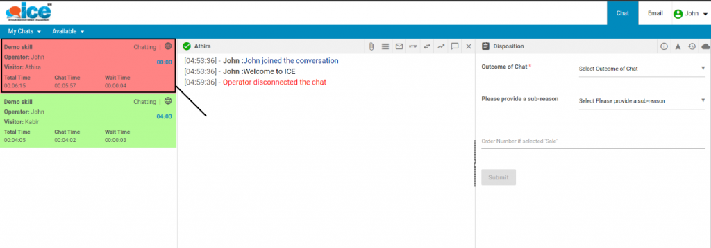 When the chat is hung up from either the visitor’s end or the agent’s end, the hung up chat will be displayed on the agent console as shown below: