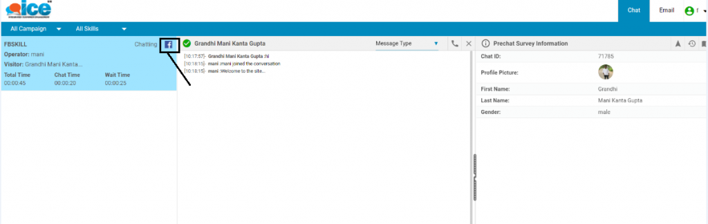 A supervisor can receive a chat request from visitor via Facebook. The console displays the icon if a Facebook chat is established as shown in the below screen-