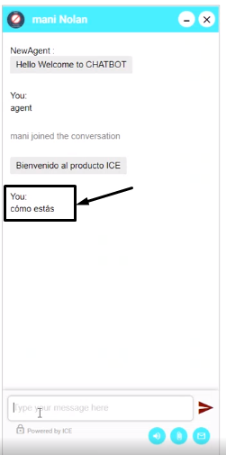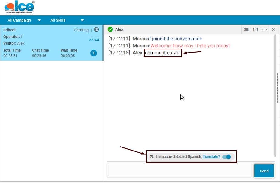 Also highlighted in the above screen is the language detector, which displays the language used by visitor. A supervisor can reply in his/her preferred language. The same message converts in visitor’s native language as shown below-