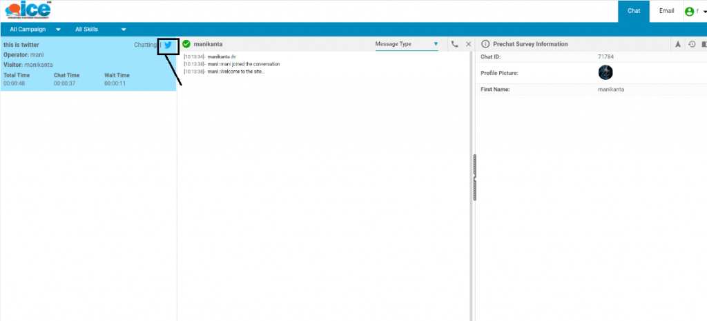 A supervisor can receive a chat via Twitter from a visitor. The console displays the icon when a chat from Twitter platform is established. This is as shown in the below screen-