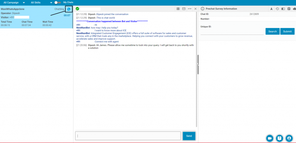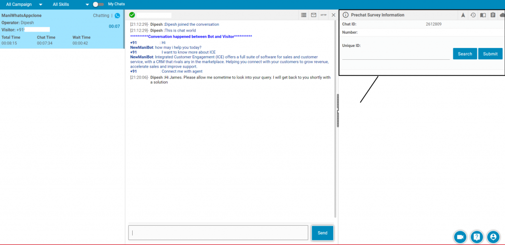 While a visitor initiates a Whatsapp chat from his/her device, a supervisor will receive a usual chat request on the console. However, a supervisor console displays a Whatsapp icon for identification-