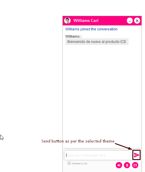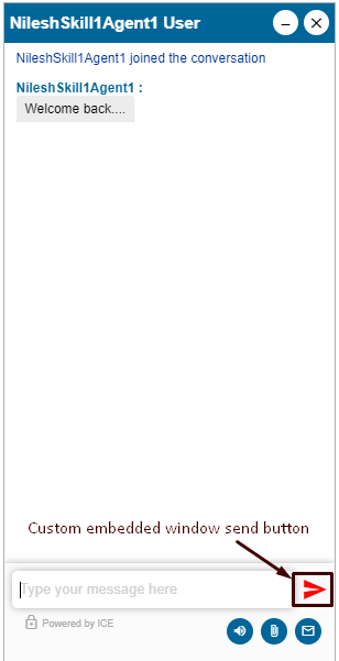 Also, highlighted on the above screen is the send button the color of which has been set as per the theme of the embedded window from Admin panel. Further, the send button color could also be set different from that of the selected color theme of embedded chat window from admin panel. This is as shown below-