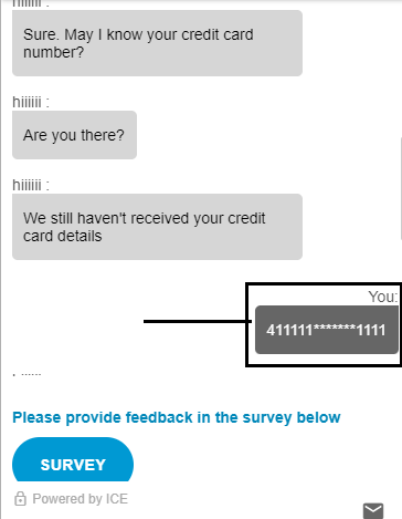 The visitor chat interface is equipped with credit card number masking feature. In this feature, when visitor enters any of his credit card number then the chat interface will display only the first and last few digits of the card. The rest of the numbers will be shown masked. This is as shown below-
