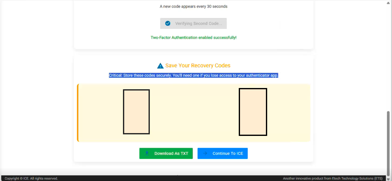 • After successful MFA activation, recovery codes are displayed.